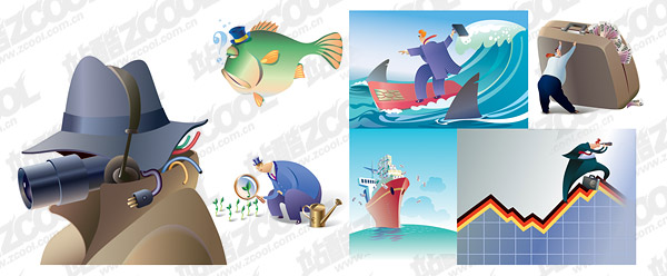 eps format, with jpg preview, the crucial words: Vector business, commerce, people, money, finance, fish, sharks, marine vessel, a magnifying glass, headphones, curves, lines, waves, the cash box